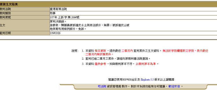 當事人因為土地、建築物,出租給台灣民政府作為辦公室,遭檢察官偵辦山坡地保育利用條例及水土保持法,兩項罪名起訴,一審在所辯護下,得到無罪判決;檢察官不服上訴二審,高院法官撤銷原判決,將水土保持法維持無罪判決,山坡地保育利用條例判決免訴。