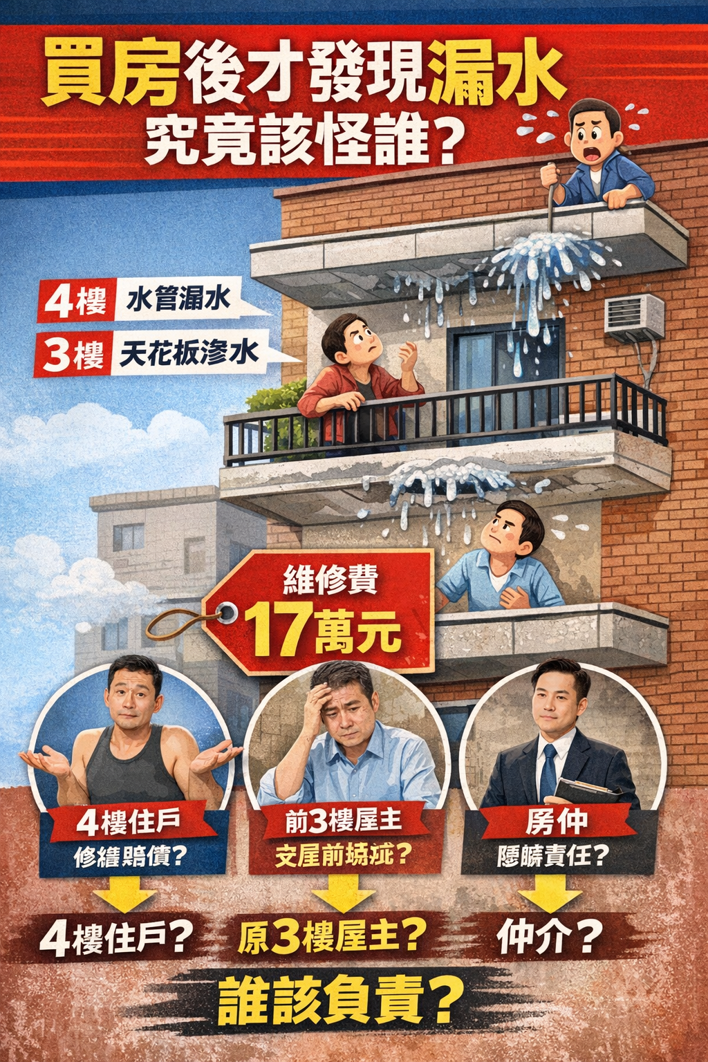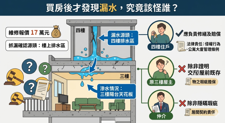 最近有則案例:有人賣掉公寓3樓,新屋主入住一年後,前陽台天花板開始滲水。抓漏後發現,水源是4樓的排水區,維修費高達17萬元。到底該找誰負責?是4樓鄰居、前屋主,還是仲介?