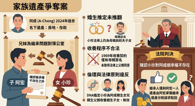 其後雖曾以收養方式試圖建立父女關係,但因未取得法律上父親同意、程序違法,加上親生父收養親生子女本身違反法律原則,收養被認定無效。法院因此認定小珍不具繼承權,父親之遺產由唯一具繼承資格的哥哥單獨繼承,無須進行分割。