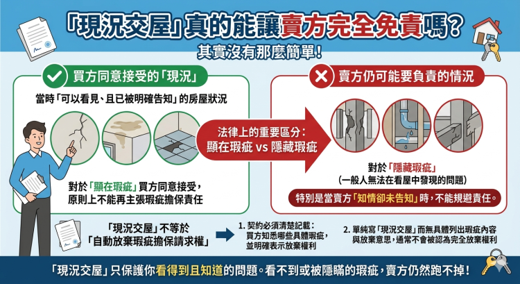現況交屋只保護「你看得到且知道的問題」,對於看不到或被隱瞞的瑕疵,賣方仍然跑不掉。