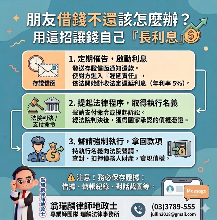 即使對方已經要負擔遲延利息,但債權人本身仍無法「自己強迫對方還錢」。這時可以透過法院程序,例如聲請支付命令或提起返還借款之訴。一旦法院認定借貸關係成立,將會判決債務人應返還借款、支付遲延利息,並負擔裁判費,取得「執行名義」。